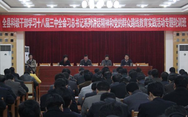 党的十八届三中全会、习近平总书记系列重要讲话精神和党的群众路线教育实践活动专题轮训班于3月3日上午在县委大会议室举行第一期开班仪式,县委书记党建中,县委副书记李安花,县委常委、县委宣传部长李淑英,县委常委、县委组织部长包世权等县上领导参加。开班仪式由李安花同志主持,党建中同志结合全县实际和当前正在开展的党的群众路线教育实践活动,通过“什么是群众路线”、“为什么要开展群众路线教育实践活动”、“怎样走好群众路线”三个方面,对第一期参加培训的151名学员进行了专题辅导。最后,李安花同志就办好此次轮训班的重要意义、学习重点、突出实效等方面提出了明确要求。
